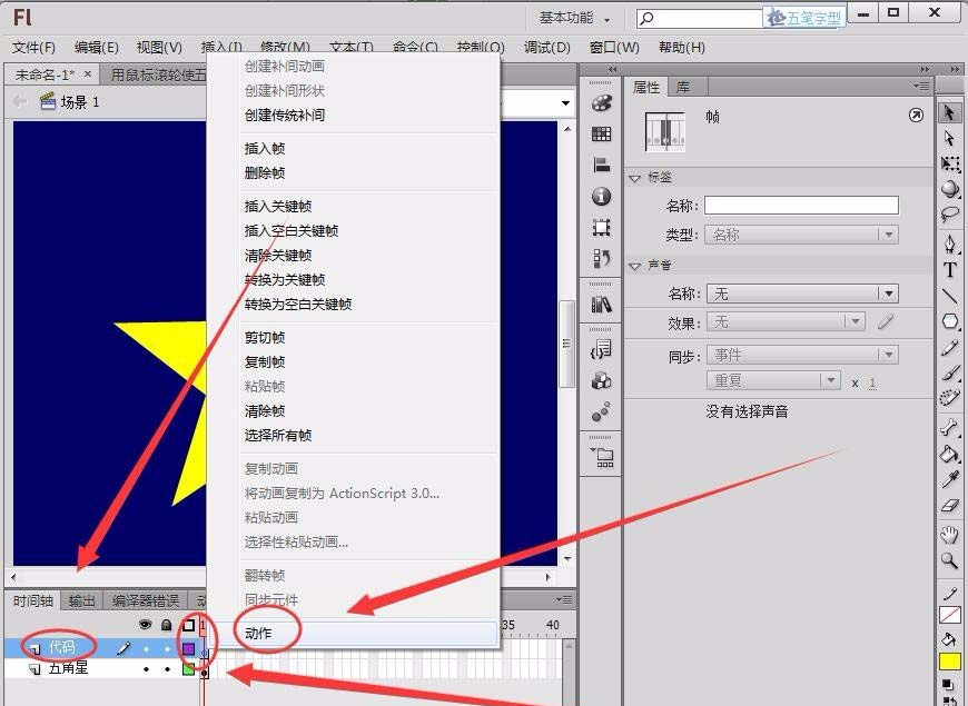 6、新建一個圖層命名為“代碼”,在圖層的第1幀右擊,在出現的右鍵快捷菜單中選擇“動作”選項。