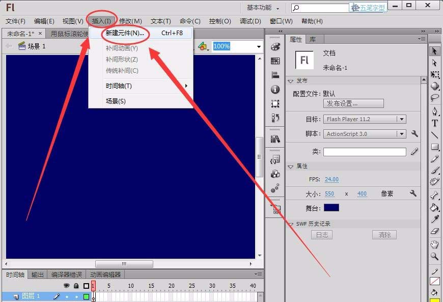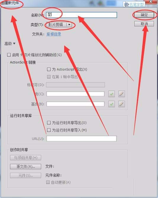 2、單擊“插入”---->“新建元件”選項,在“創建新元件”對話框中,將“名稱”取名為“星”,“類型”設置為“影片剪輯”元件,單擊確定。