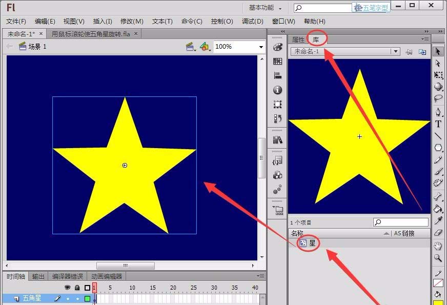 4、回到場景1,將“庫”面板中的“星”元件拖到舞臺的適當位置。