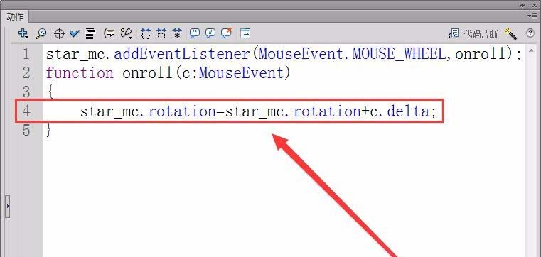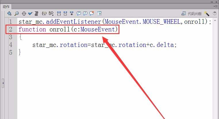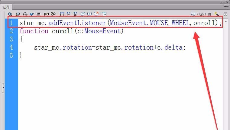 7、首先,注冊影片剪輯元件star_mc的鼠標滾輪事件的偵聽器,接收者函數為onroll。