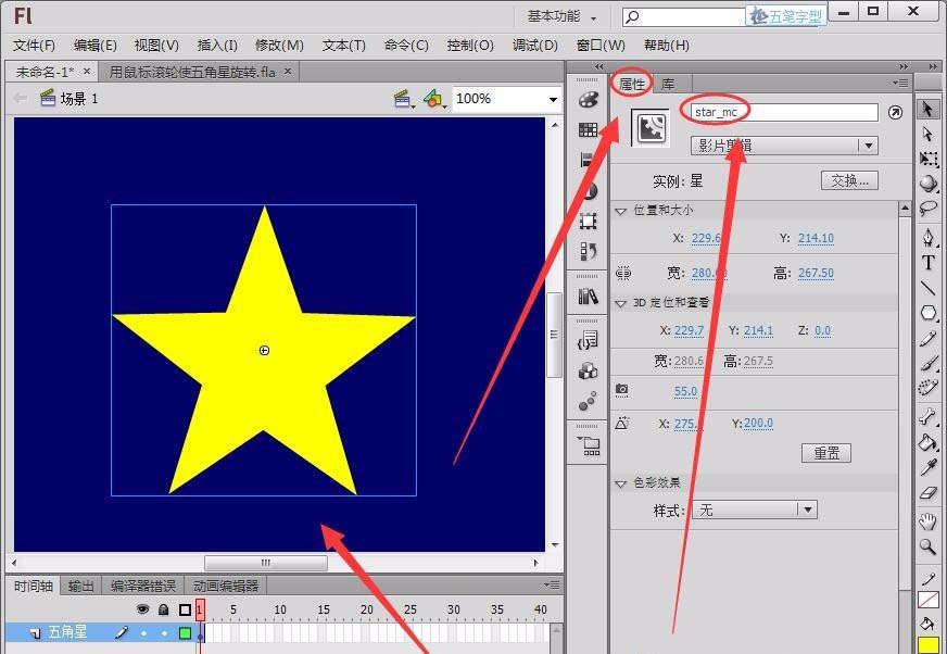 5、選中舞臺中的星形,在“屬性”面板中將“實例名稱”取名為“star_mc”。