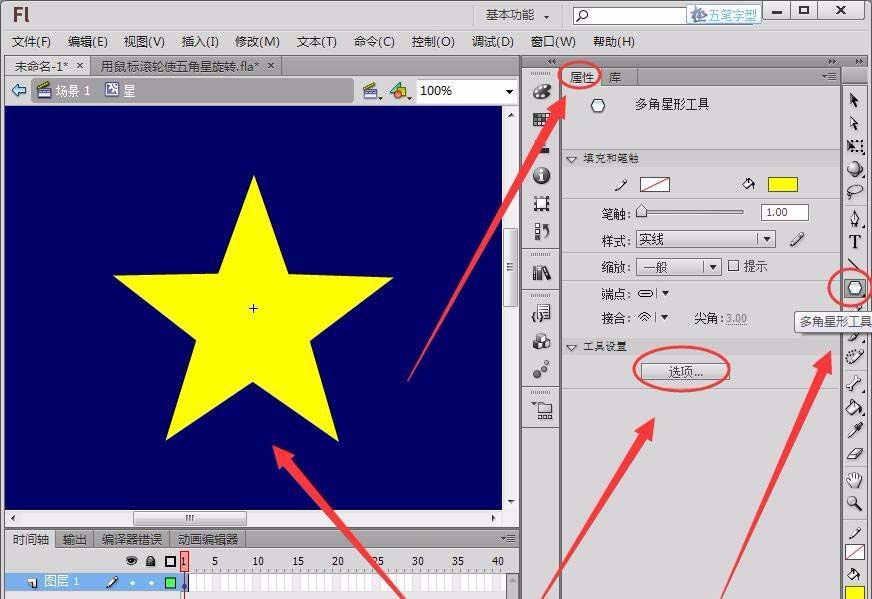3、在“編輯欄”選擇“多角星形工具”,“屬性”面板中的“選項”設置為“星形”,在“星”元件編輯窗口中繪制一個五角星。