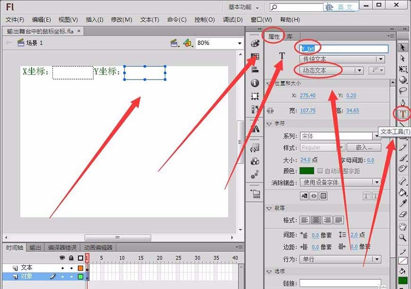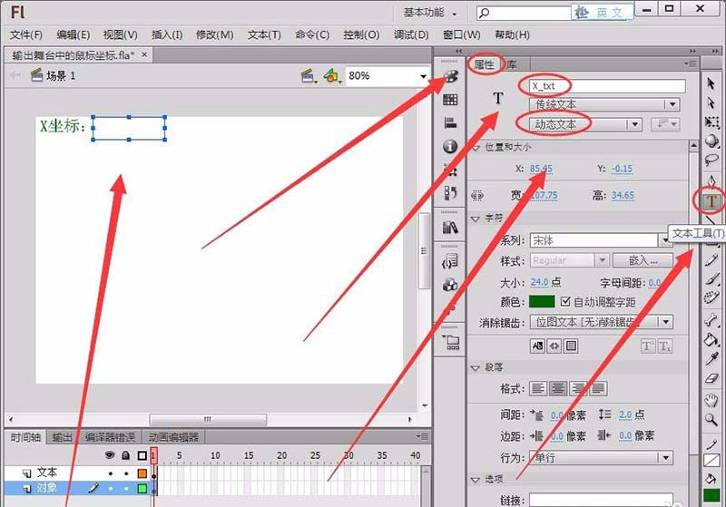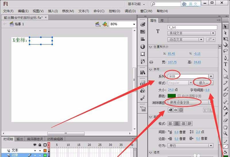 6、在“編輯欄”中選擇“文本工具”,在“屬性”面板中選擇“動態(tài)文本”,在舞臺繪制一個動態(tài)文本框,將“實例名稱”取名為“X_txt”,用以輸出鼠標(biāo)的X軸坐標(biāo)。(注:要嵌入字體,運行程序后舞臺才能正常顯示動態(tài)文本)