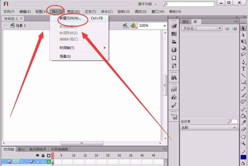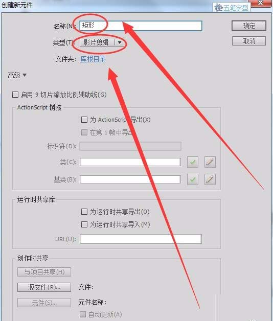 2、單擊“插入”---->“新建元件”,新建一個名為“矩形”的影片剪輯元件。