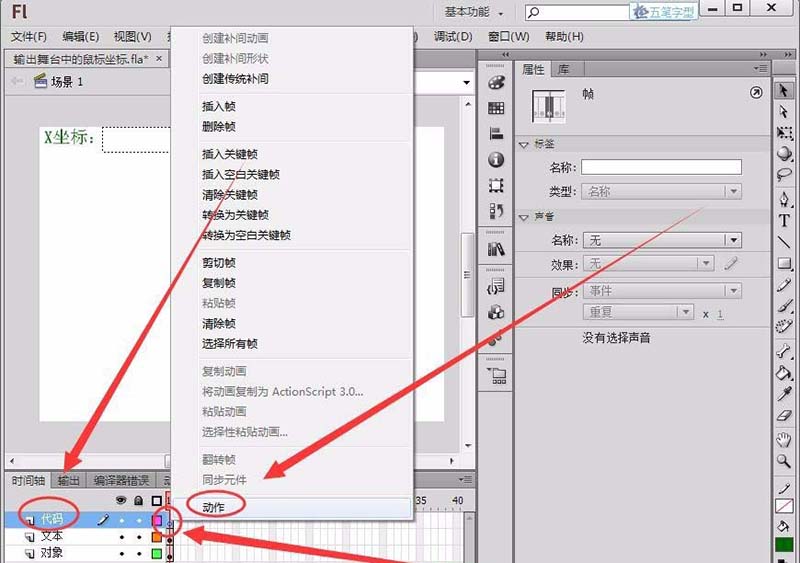 8、新建一個圖層,命名為“代碼”,在圖層的第1幀右擊,選擇“動作”選項。
