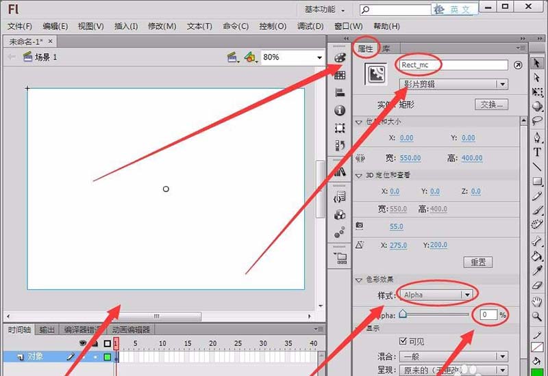 5、選中矩形,在“屬性”面板中,選擇“樣式”中的“Alpha”,將值改為0,將“實例名稱”取名為“Rect_mc”。
