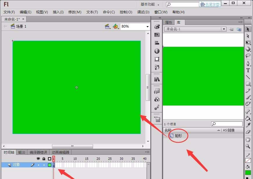 4、回到場景1,將矩形拖動到舞臺中,注意將矩形的左上方與舞臺左上方對齊,即讓矩形覆蓋整個舞臺。
