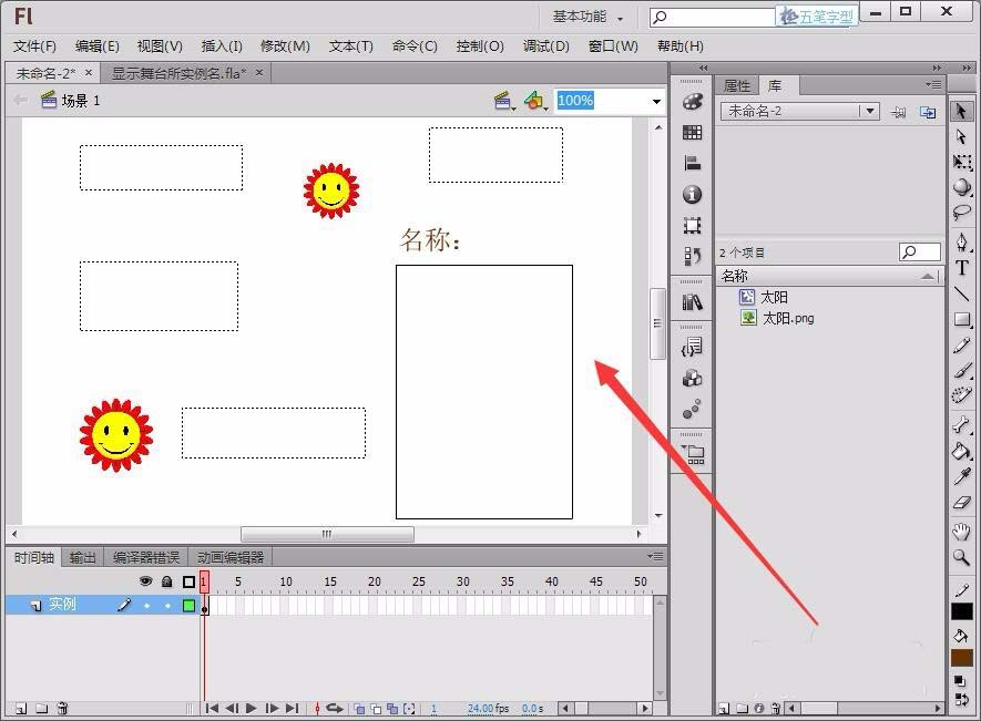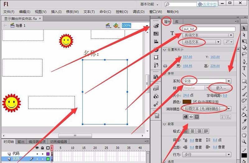 2、在舞臺中任意插入4個動態文本框,兩個影片剪輯對象,一個靜態文本框“名稱:”。將其中的一個動態文本框取名為“text1_txt”,其中的一個影片剪輯元件取名“sun_mc”。最后,插入一個動態文本框將“實例名稱”取名為“out_txt”,用來輸出實例名。
