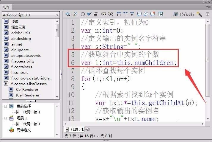 6、定義一個變量,獲取舞臺中所有實例的個數。