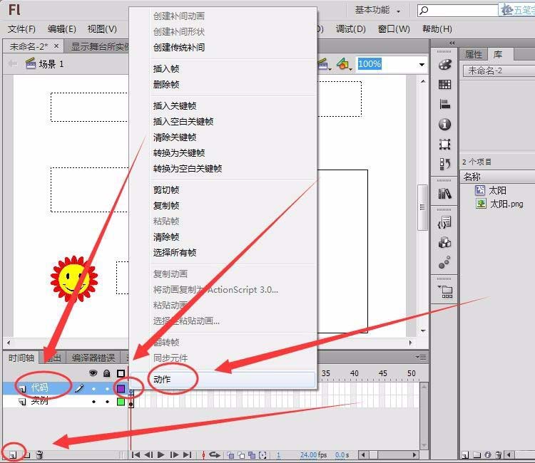 3、新建一個圖層命名為“代碼”,在圖層的第一幀右擊,選擇“動作”選項。