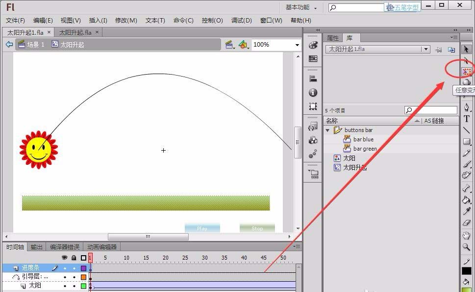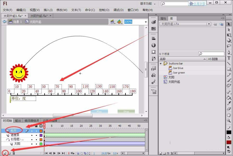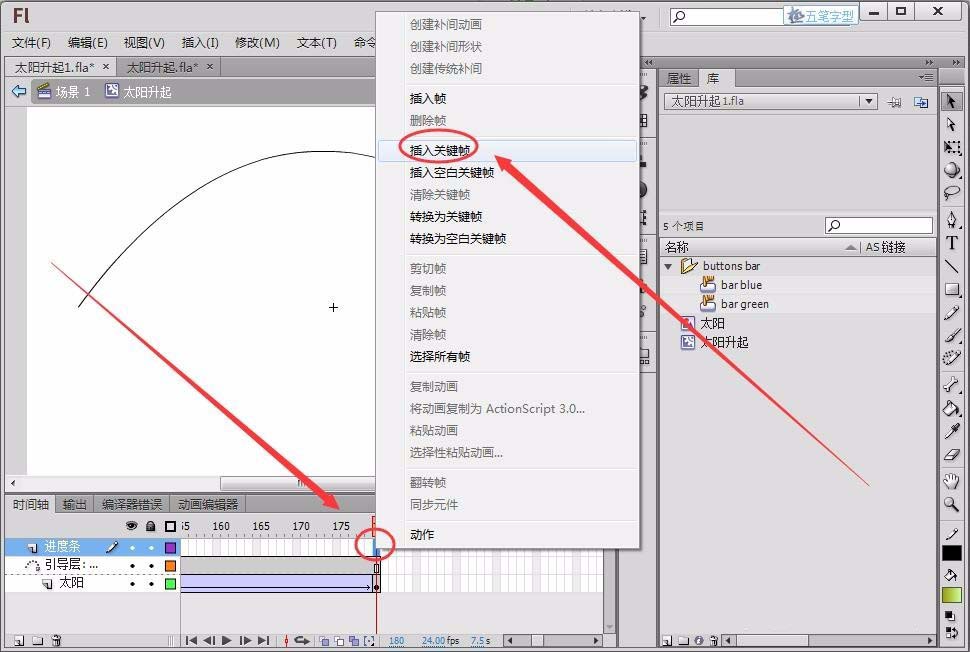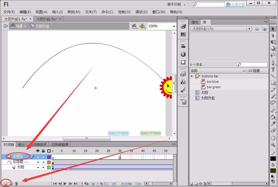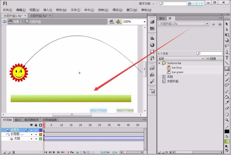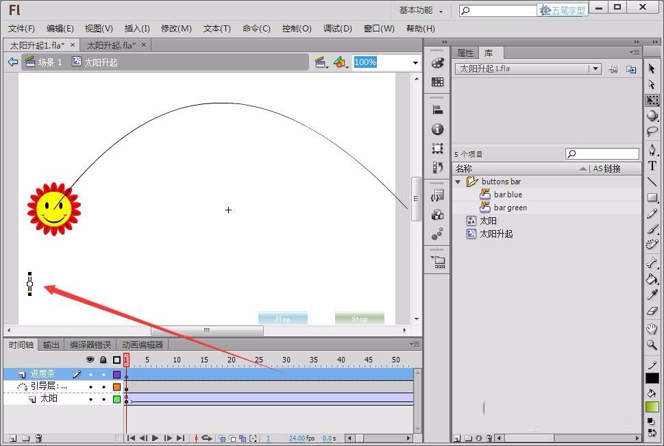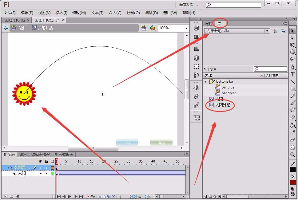 2、打開“庫”面板,雙擊“太陽升起”影片剪輯元件,進入編輯界面。