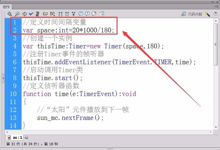 8、首先,定義時間間隔變量space,其值為動畫運行時間20秒乘以1000(換算成毫秒),再除以“太陽升起”的總幀數180幀。