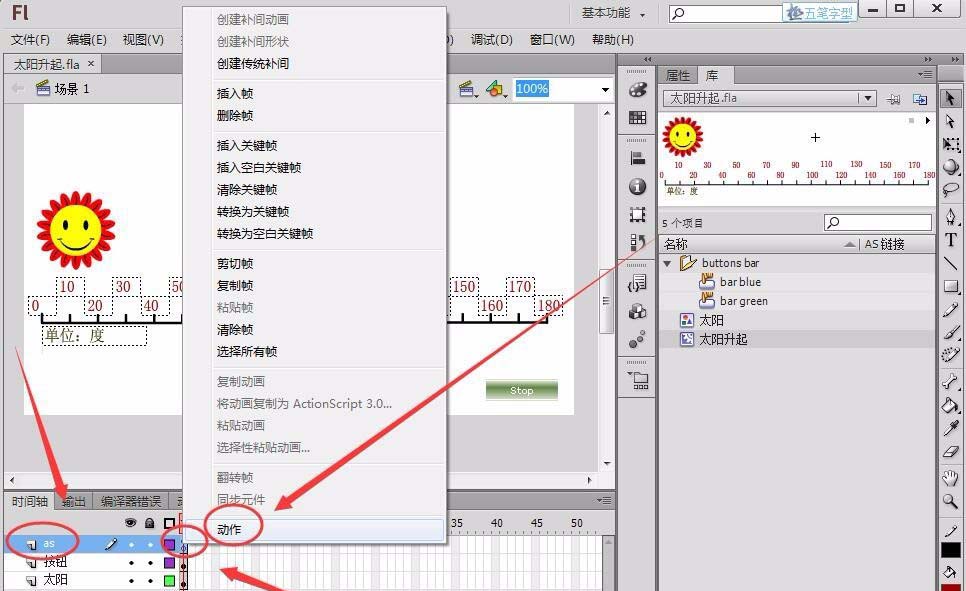 7、在“as”圖層的第一幀右擊,選擇“動作”選項。