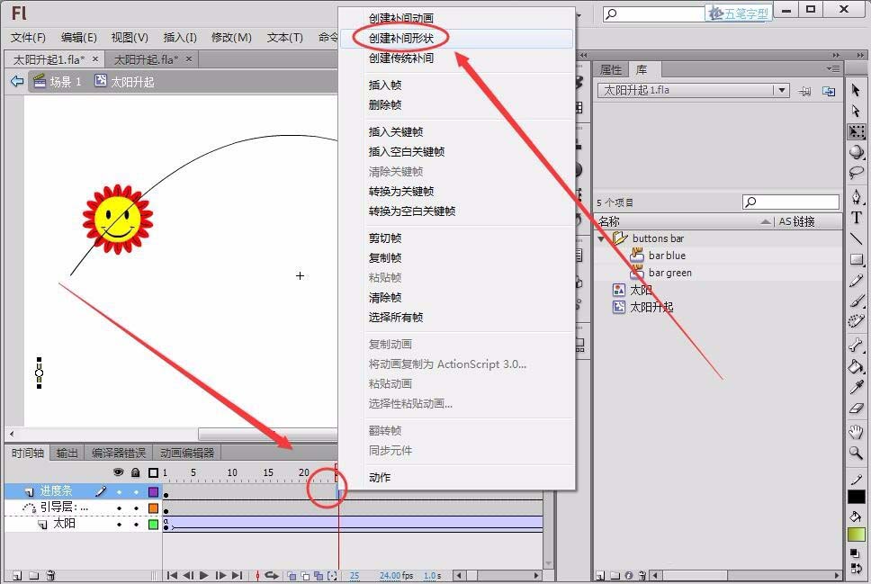 5、在“進度條”圖層的起始與結束處任意一幀右擊,選擇“創建補間形狀”,創建一個補間動畫。