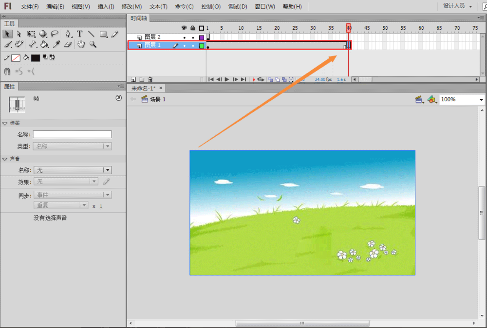 8、點擊圖層二,在40的格子方法點擊f6創(chuàng)建關鍵幀,并將小狐貍的位置拖動到另一邊。