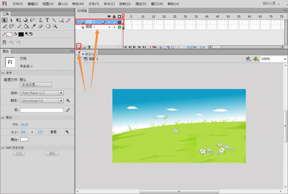 1、打開flash軟件,創(chuàng)建一個新的文檔