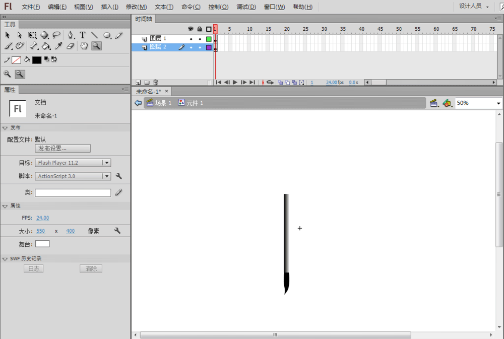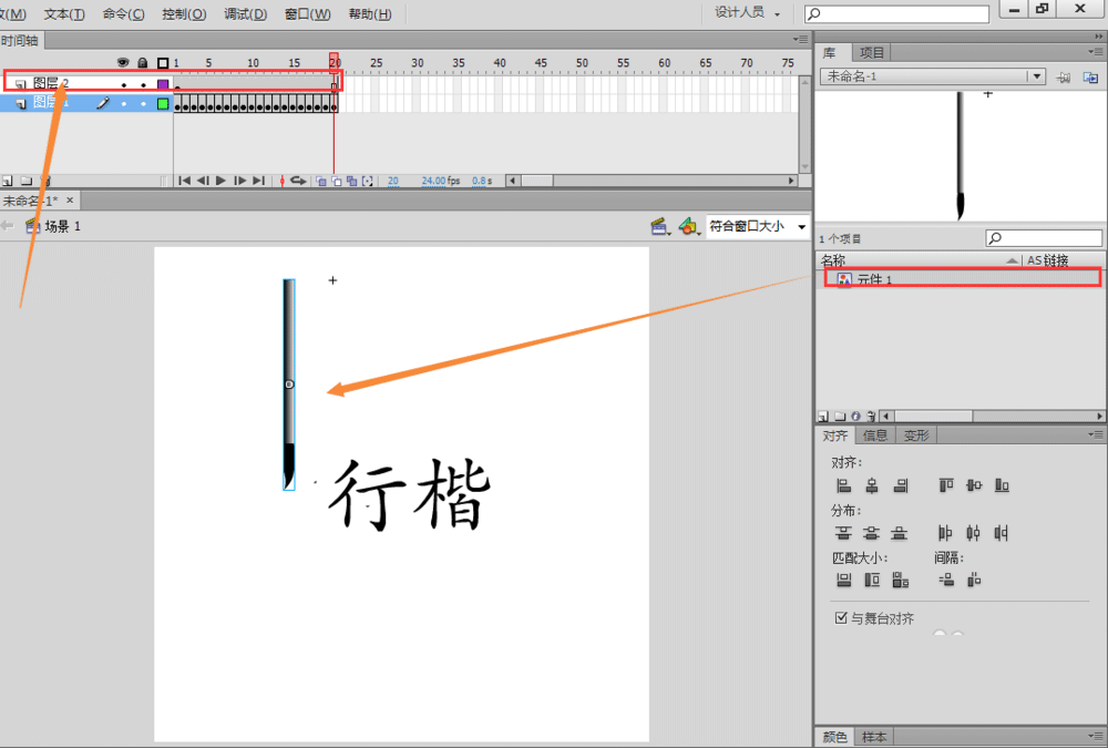 7、新建一個圖層,將庫中的毛筆元件拖入其中