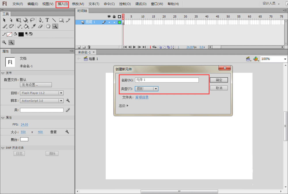 2、點(diǎn)選【插入】-【新建元件】-【圖形】 ,最后點(diǎn)擊確定