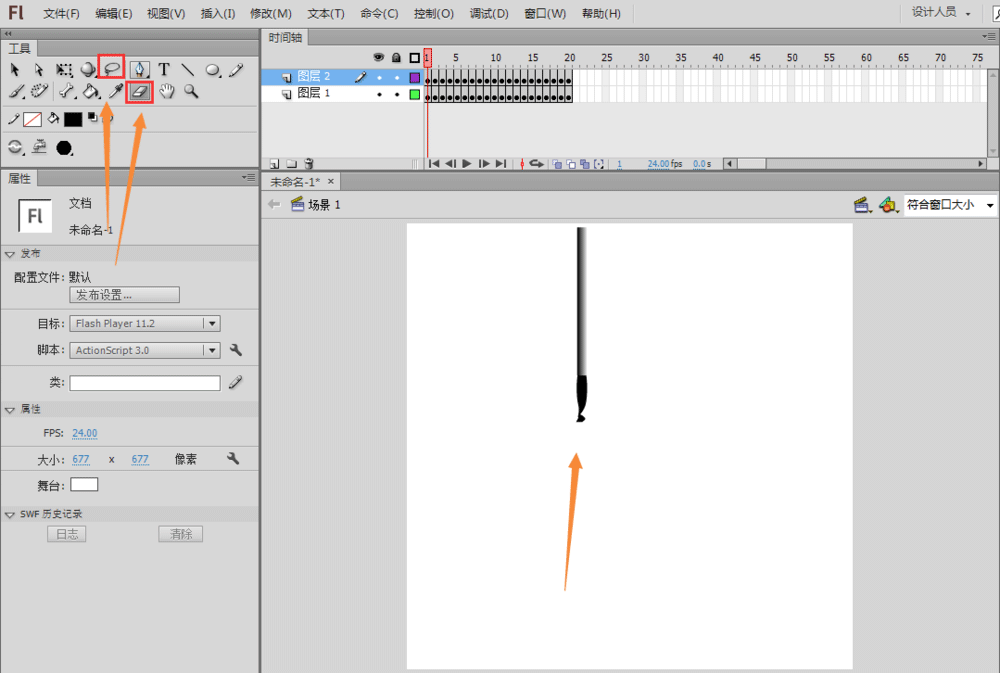 10、比如在第一幀的時候,用套索工具以及橡皮擦工具將多余的字體擦除,并將毛筆放置于合適的位置。