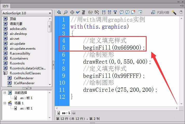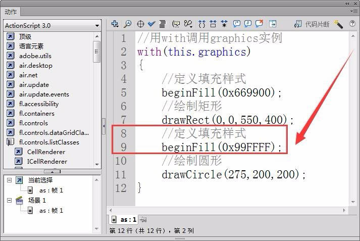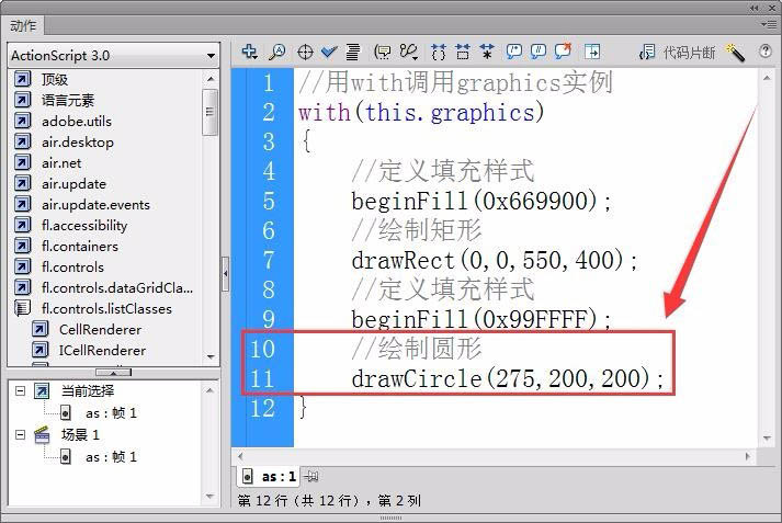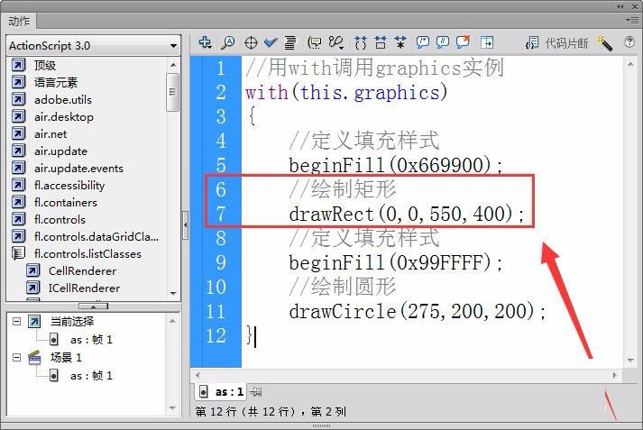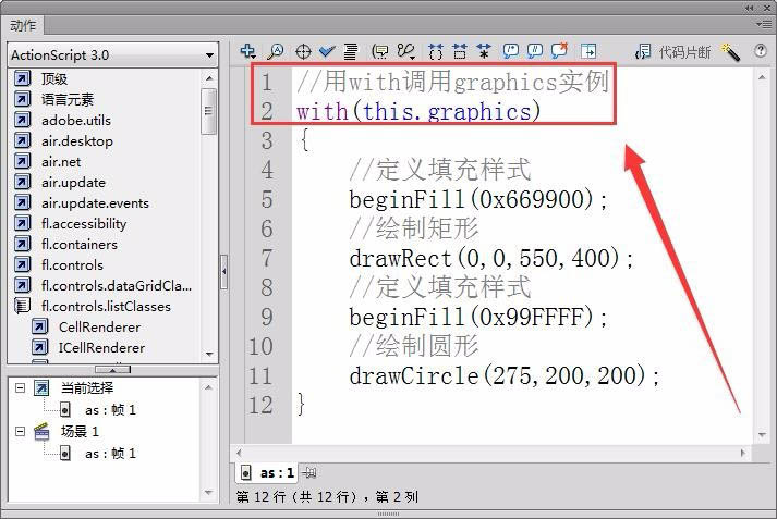 3、首先,用with函數調用graphics實例,用this引用主時間軸。