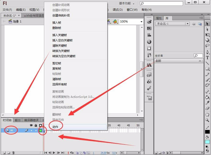 2、將圖層1命名為“as”,在圖層的第一幀右擊,選擇“動作”選項。