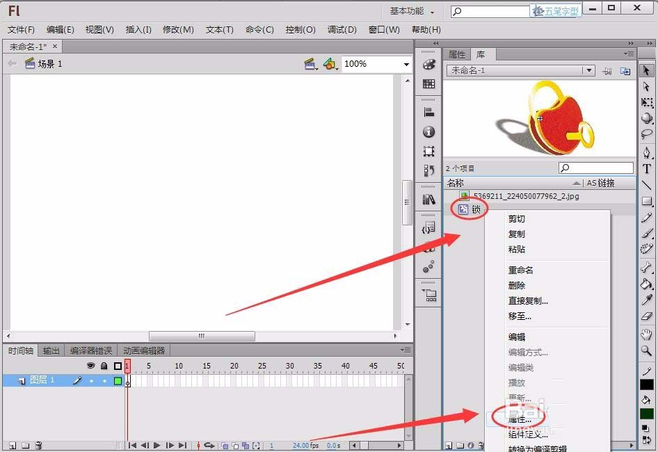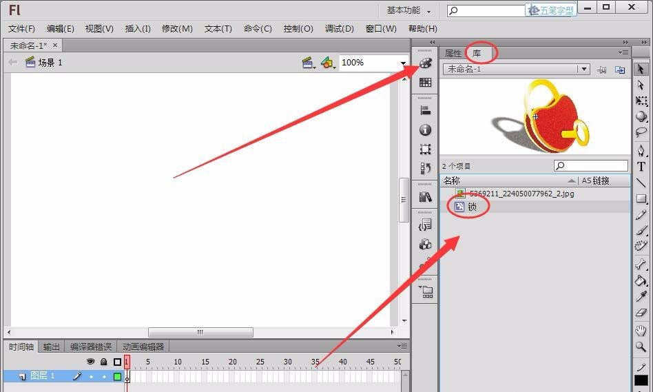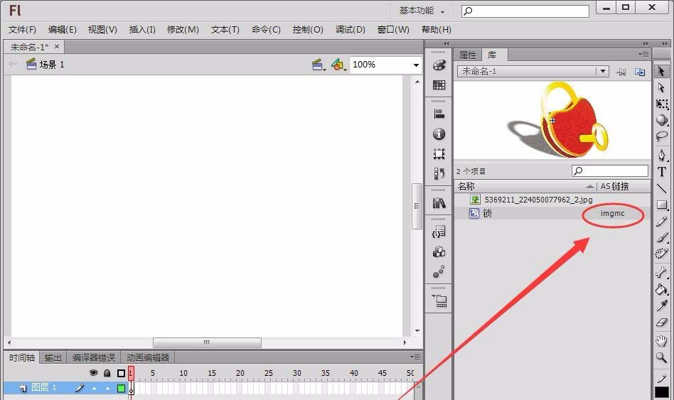 5、回到場景1,打開“庫”面板,找到新建的“鎖”元件。