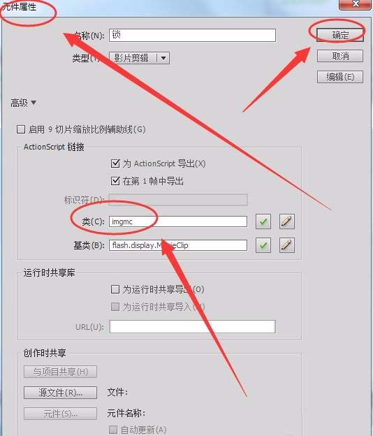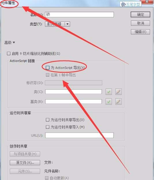 7、在“元件屬性”窗口中,選擇“為ActionScript導出”前面的勾。