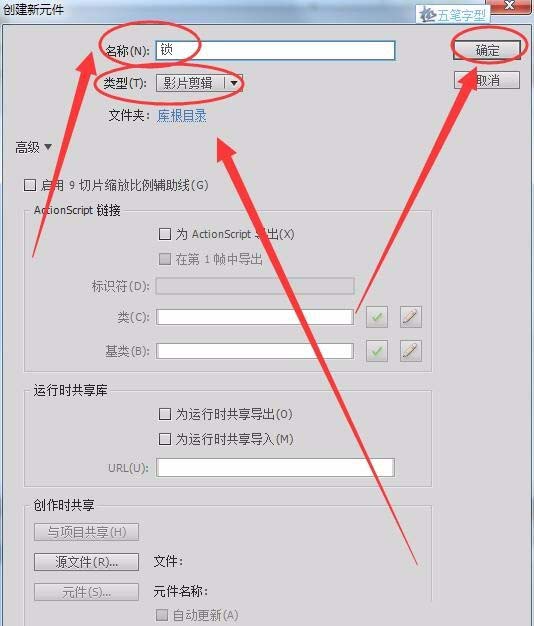 3、在“創建新元件”對話框中,將元件名稱改為“鎖”,類型選擇“影片剪輯”,單擊“確定”。