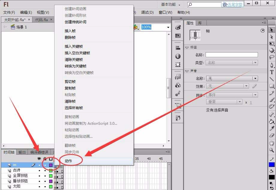 3、將所有幀往后拖動一格,在“as”圖層的第一幀上右擊,選擇“動作”選項(xiàng)。