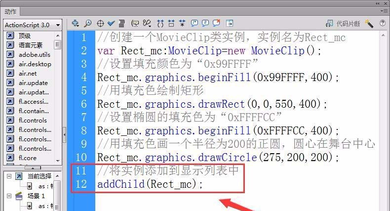 9、最后,將影片剪輯實(shí)例“Rect_mc”,添加到顯示列表中。“動作“面板中的代碼如下圖所示。