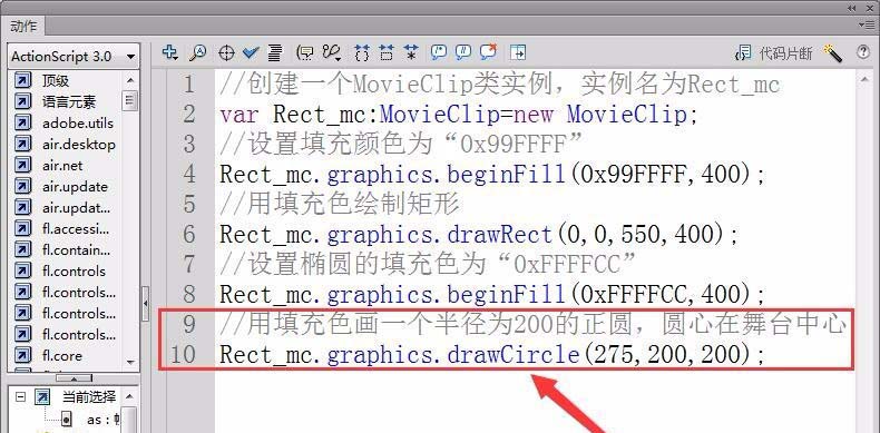 8、然后,用填充色畫一個(gè)半徑為200的正圓,圓心在舞臺中心即坐標(biāo)為(275,200)。輸入的代碼如下圖所示。