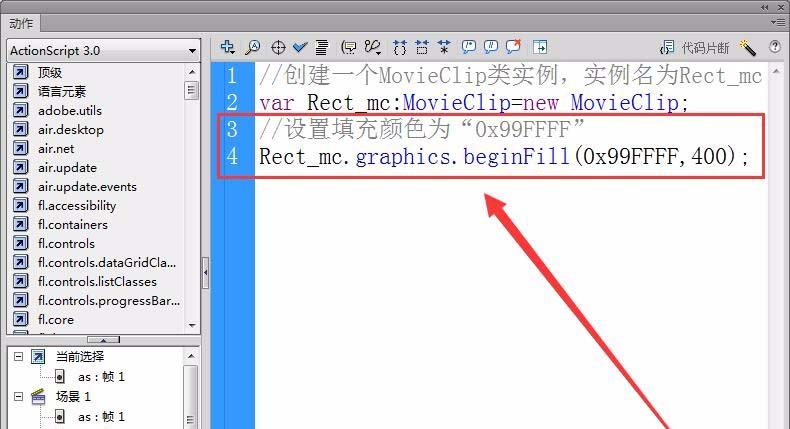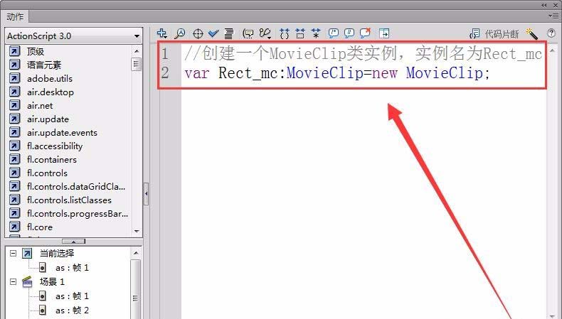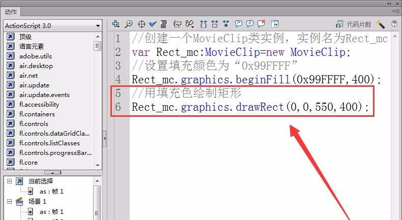 4、首先,創(chuàng)建一個(gè)MovieClip類實(shí)例,實(shí)例名為“Rect_mc”。在“動作”面板輸入以下代碼。