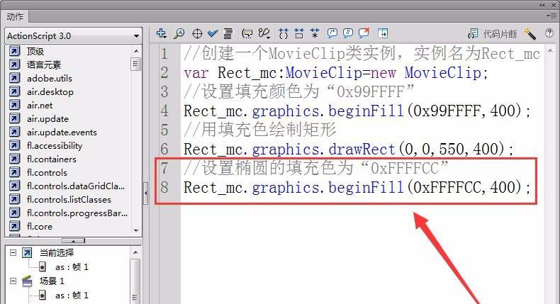 7、然后,設(shè)置橢圓的填充色為“0xFFFFCC”。在“動作”面板輸入以下代碼。