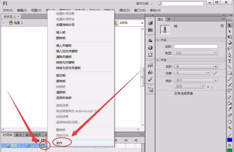 2、在需要輸入代碼的幀上右擊,選擇“動作”選項。