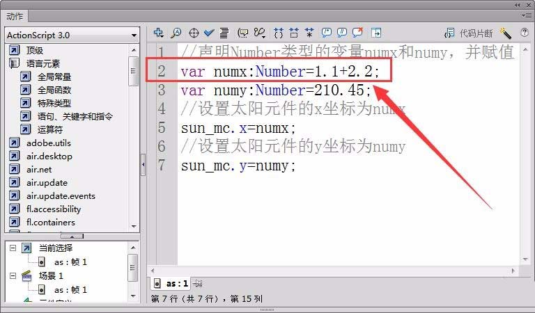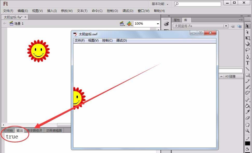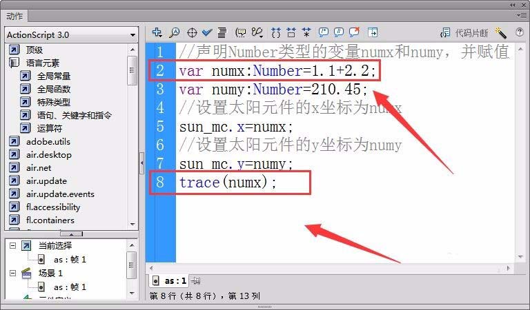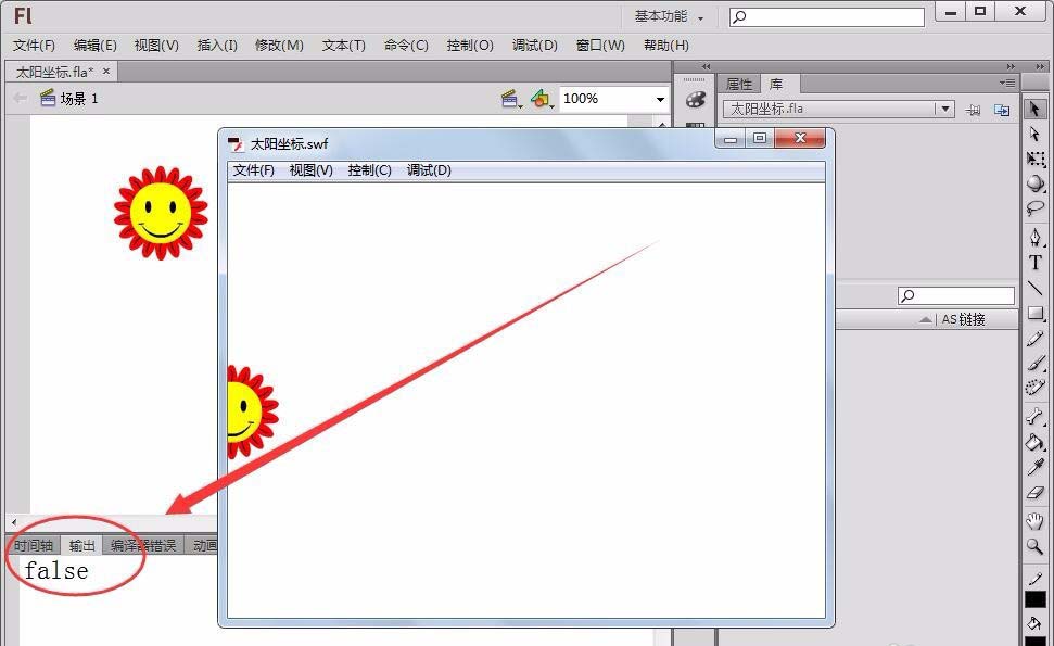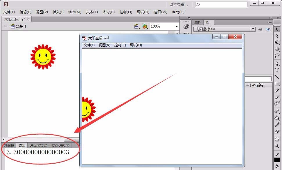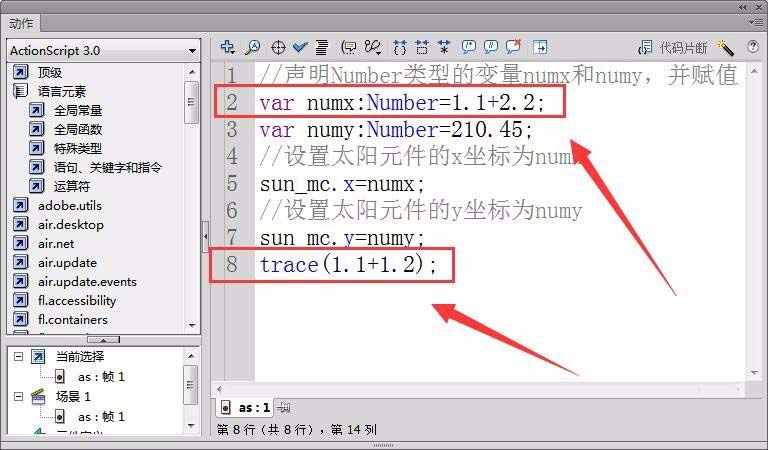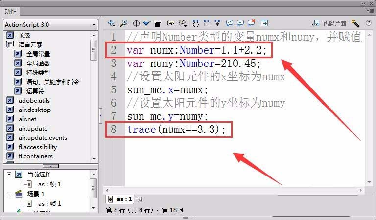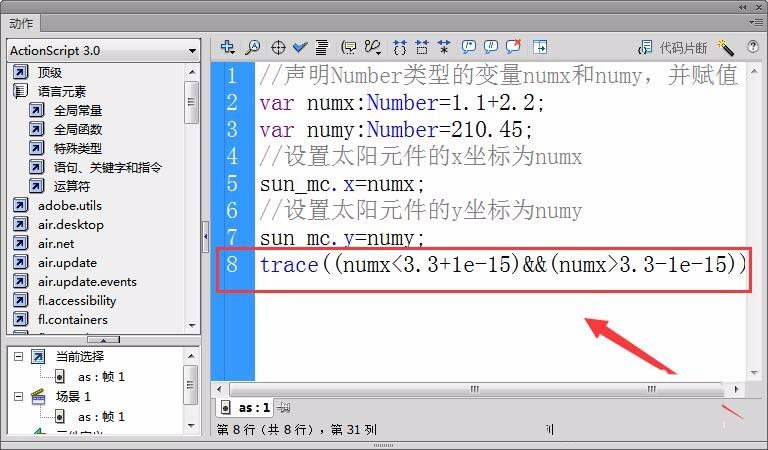 9、測(cè)試程序,從測(cè)試的結(jié)果可以看出,相加后的數(shù)值與兩數(shù)相加的和“3.3”不同。在Flash中,整數(shù)計(jì)算沒有誤差,但浮點(diǎn)數(shù)計(jì)算總會(huì)出現(xiàn)誤差,所以在使用“==”判斷時(shí)值為“false”。