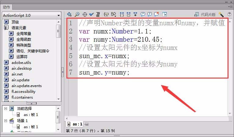 3、在“動(dòng)作”面板中輸入以下代碼。