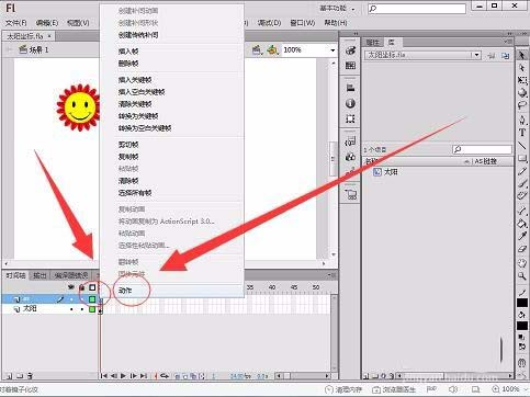 2、在需要輸入代碼的幀上右擊,選擇“動(dòng)作”。