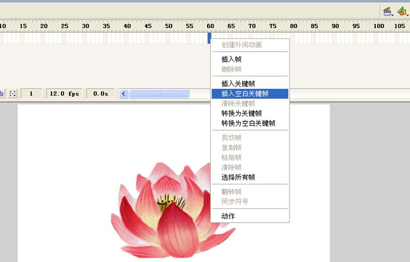 3、執(zhí)行ctrl+b組合鍵將圖片打散,在60幀處右鍵單擊從下拉菜單選擇插入空白關(guān)鍵幀。