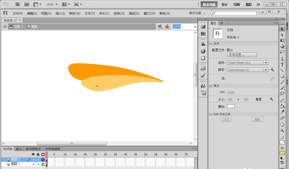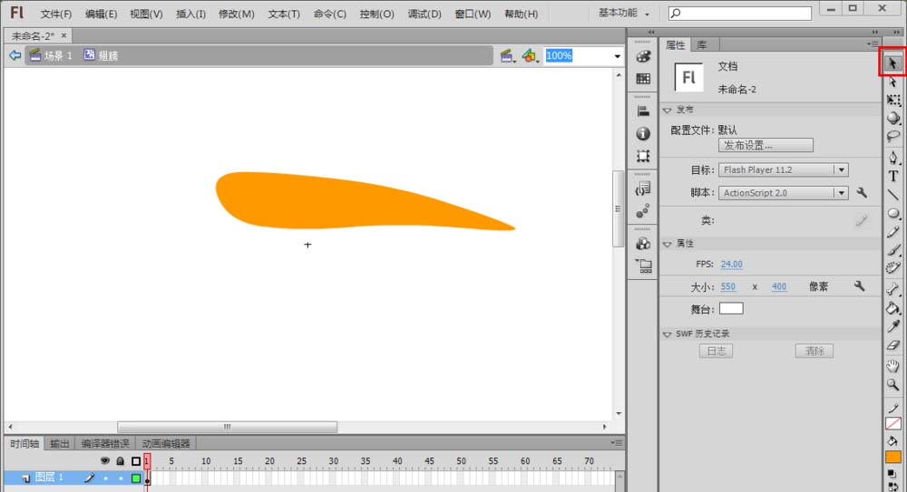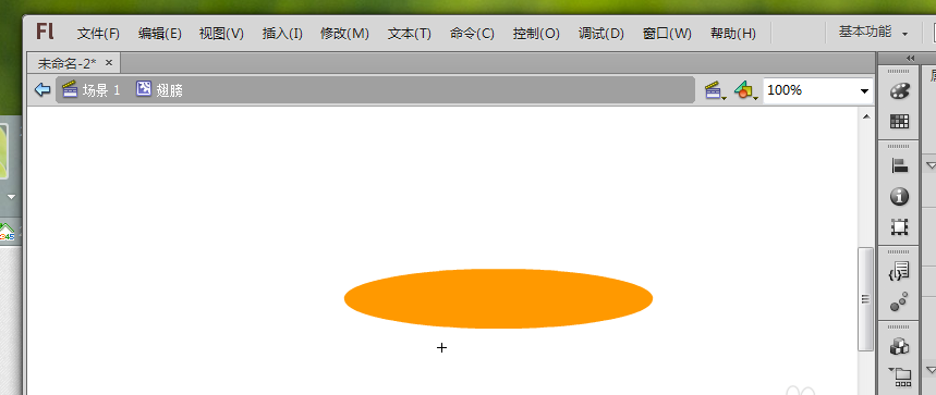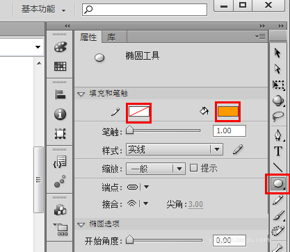 3、在元件中選用【橢圓工具】,筆觸改為【無】,填充顏色為【#FF9900】,畫出的橢圓形用【選擇工具】進行調整。