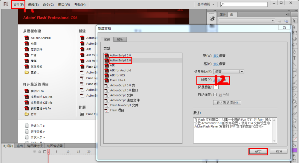 1、打開Flash,點擊【文件】新建文檔,類型選擇【ActiveScript 2.0】,幀頻改為【12】,之后點擊【確定】創建文檔。