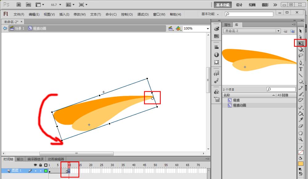 6、在第10幀中插入關鍵幀,用【任意變形工具】進行調整。
