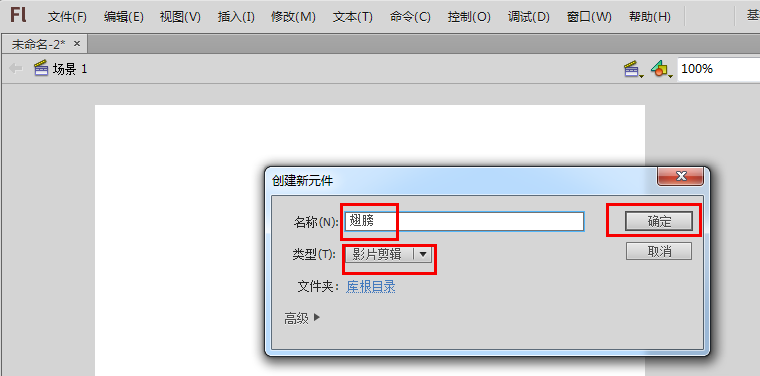 2、點擊【插入】新建元件,名稱改為【翅膀】、類型選擇影片剪輯,之后點擊【確定】創建元件。