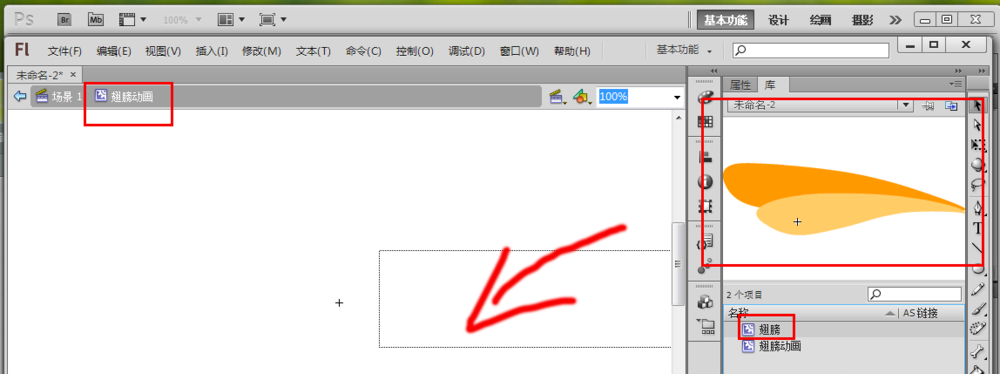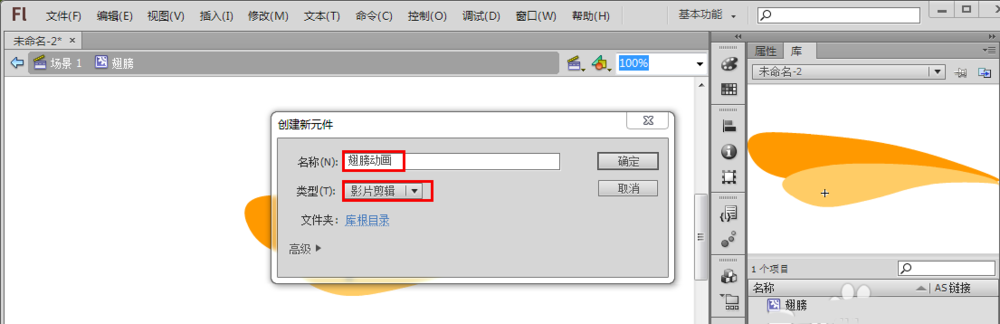 5、新建元件,名稱改為【翅膀動畫】類型選擇【影片剪輯”,點擊【確定】創建元件,把【翅膀】元件的素材拉入【翅膀動畫】元件中。