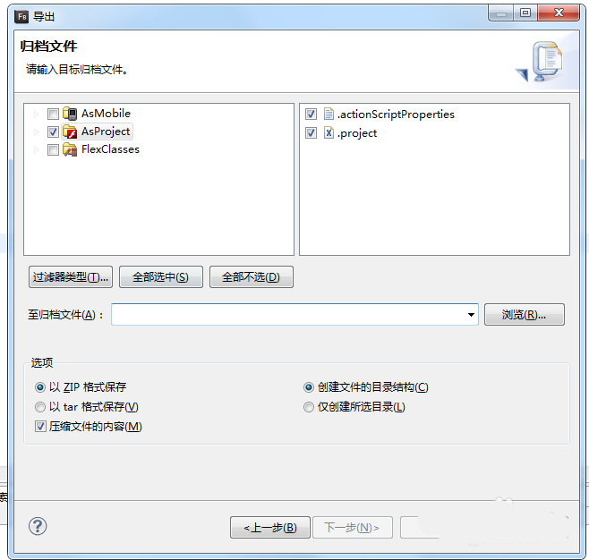 瀏覽到用于保存導(dǎo)出的項(xiàng)目的位置,然后指定文件名。指定歸檔文件選項(xiàng),然后單擊“ 完成”。