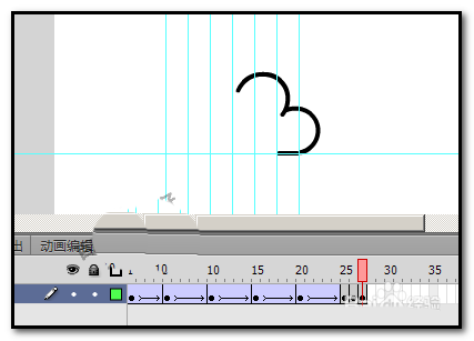 7、在第26幀插入關鍵幀再畫出一個弧形,連在線段上。在第27幀,同樣,插入關鍵幀;再畫出一個弧形;在第28幀,第29幀,分別插入關鍵幀;各再畫出一個弧形