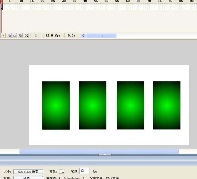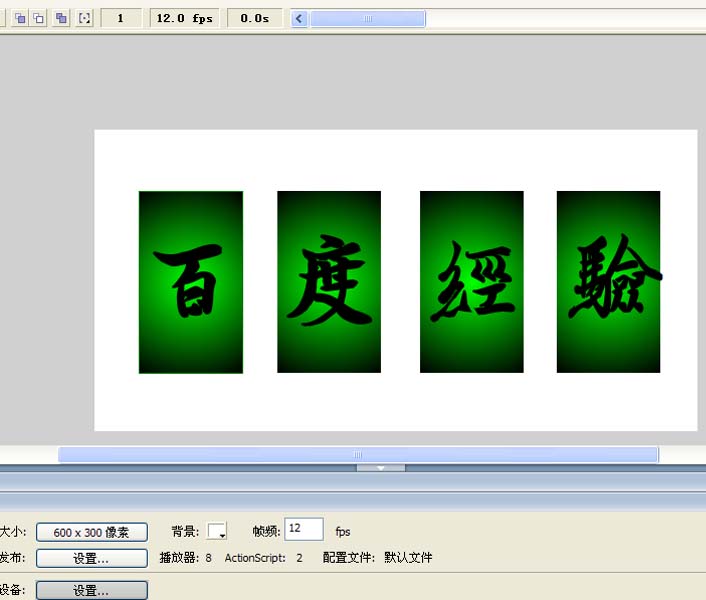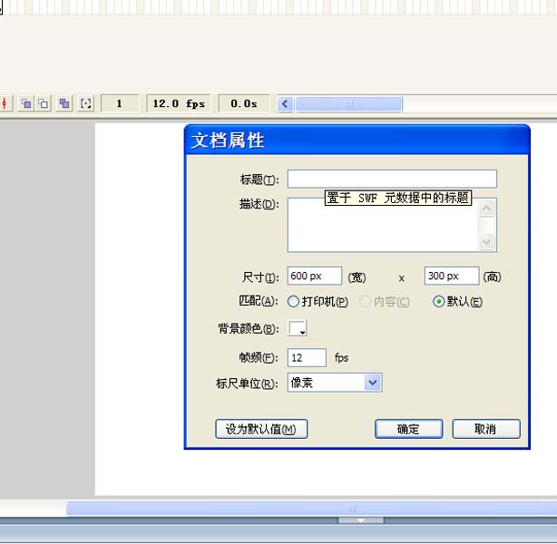 1、首先啟動flash8,新建一文檔,設(shè)置大小為600*300,背景顏色為白色,幀頻為12fps。