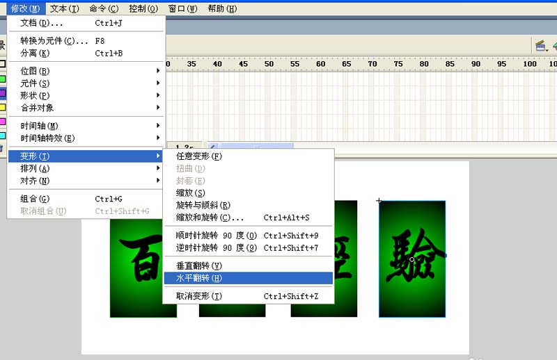 6、在元件圖層1-4的第15幀處插入關(guān)鍵幀,接著分別執(zhí)行修改-變換-水平翻轉(zhuǎn)命令。