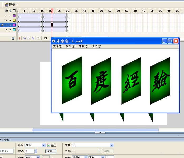 8、在元件圖層1-4中,分別在1-15,26-30之間創(chuàng)建傳統(tǒng)補(bǔ)間動畫,執(zhí)行ctrl+enter組合鍵測試動畫。