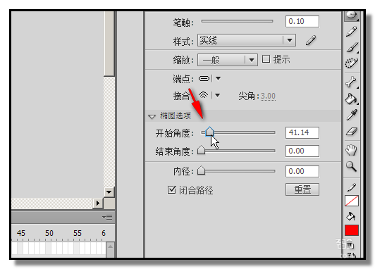 6、我們在“開始角度”這里操作。鼠標(biāo)點(diǎn)住“開始角度”的滑塊向右邊慢慢移動(dòng),