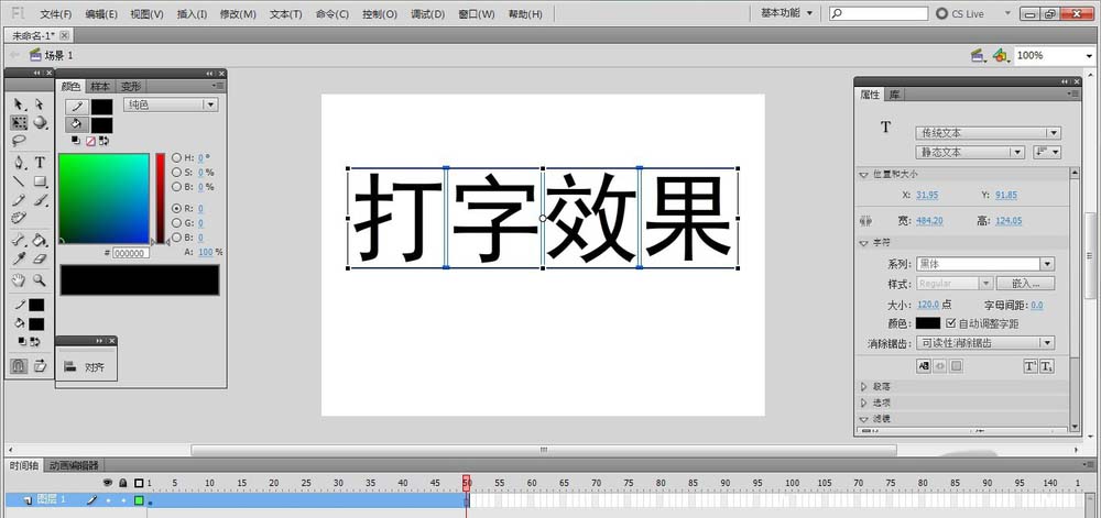 1、使用“文本”工具,設置字體黑體,顏色黑色,大小120點,隨后輸入文字“打字效果”。